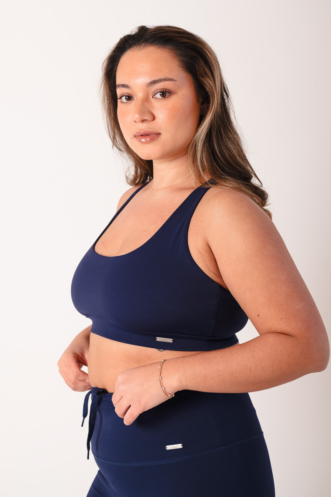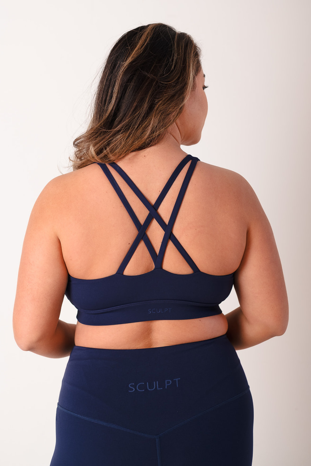 A returning favourite but in a brand new colour for our amazing new Autumn 2024 Navy collection, introducing our incredible Cross Back Sports Bra in Navy. Perfect for a Medium/High Impact workout with a super support band and a scoop neck for more coverage and made from the same material as our Tierra bra, for that super comfortable and soft feel.