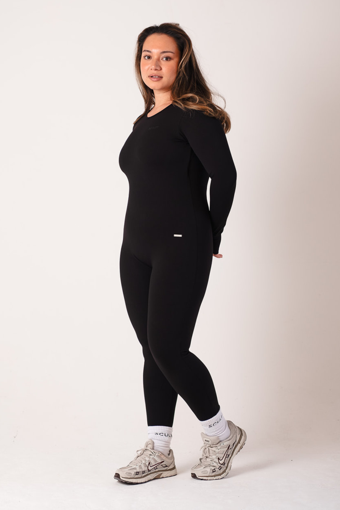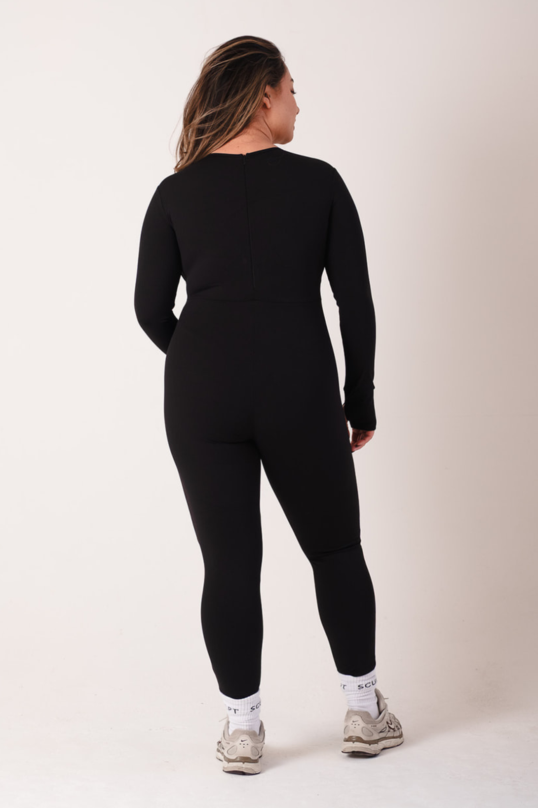 Featuring our amazing soft matte black material and an updated neckline, the longsleeve jumpsuit is the perfect addition to your wardrobe for a low intensity workout or to wear casually with your other Off Duty pieces.