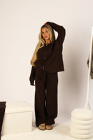 The wide-leg silhouette offers a relaxed yet polished look, while the two practical pockets and signature metal tag on the waistline add functional detail with a premium touch. Styled effortlessly with the matching Teddy Knit Zip Through Jacket or Off Shoulder Knitted Top, these pants transition seamlessly from lounge to lifestyle.