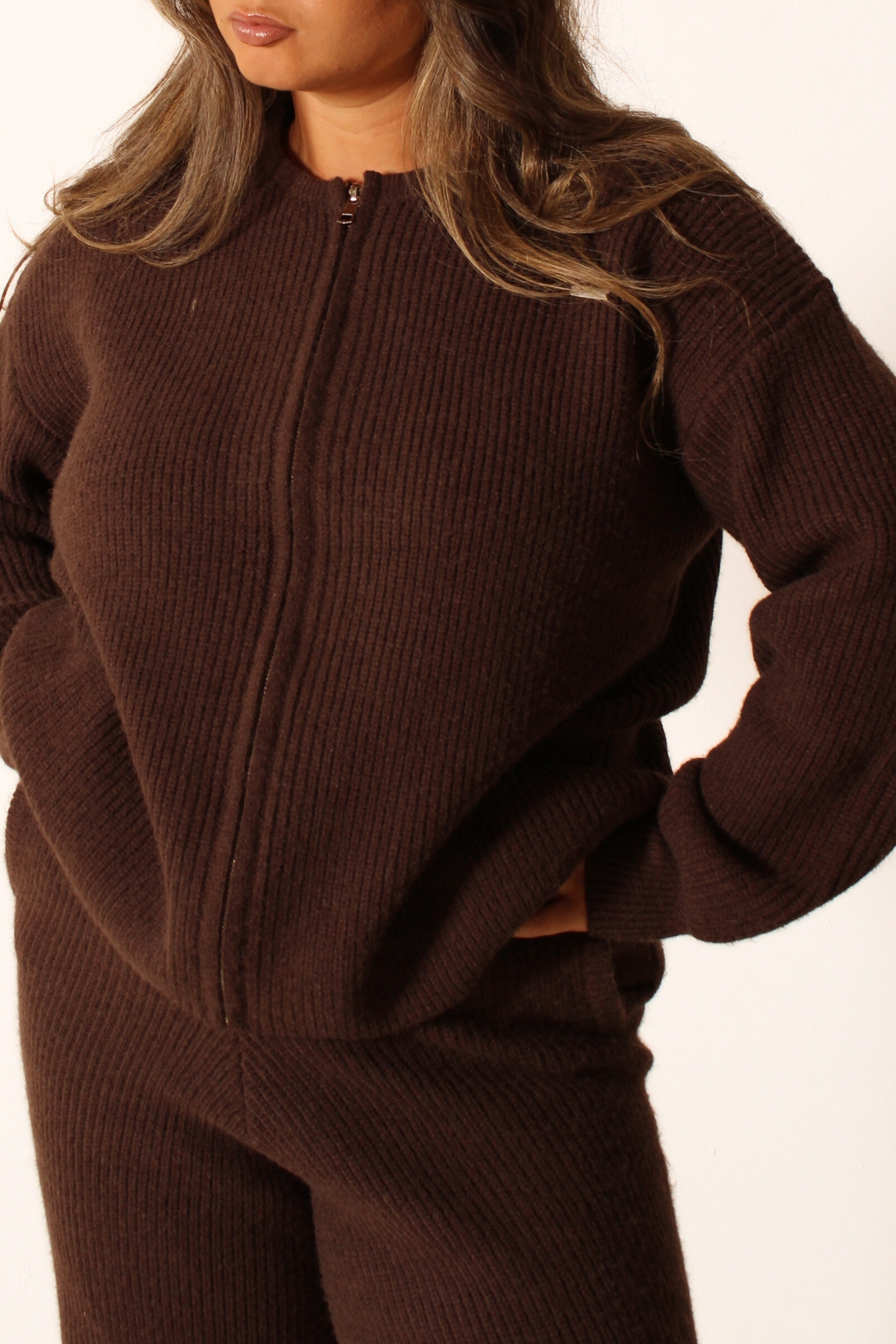 Finished with a sleek metal zip-through front, long cuffed sleeves, and a signature metal tag on the chest, this jacket brings elevated detailing to an everyday staple. Its versatile brown hue makes it easy to pair with the matching Teddy Knit High Waisted Pants or your go-to loungewear.